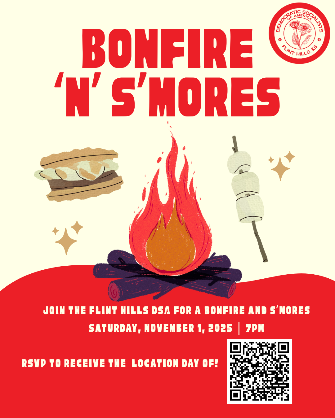 Join the Flint Hills, Kansas Chapter of Democratic Socialists for a bonfire and s'mores. We will have vegan options available! Feel free to bring your own drink (preferably non-alcoholic), camping chair (but we will have some extras), and a camp-fire instrument. The location will be shared with those who RSVP the morning of Saturday, November 1.