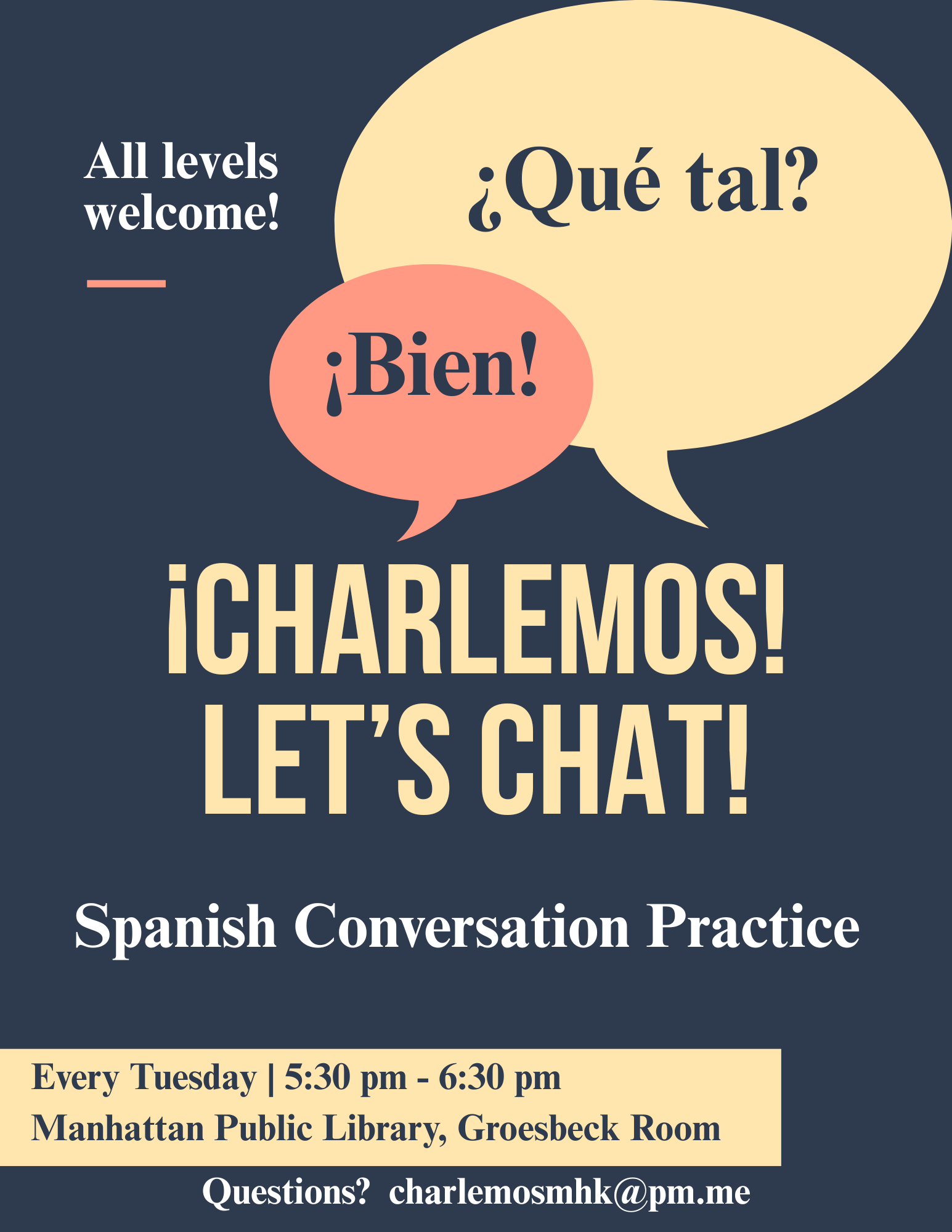 Each week at the Manhattan Public Library in the Groesbeck Room, Derron, one of the Chapter Administrative Coordinators, will be leading a weekly Spanish conversation practice session for anyone who would like to improve or maintain their Spanish. All levels are welcome! We would love to have first-language speakers as well! This is a judgment-free and open space to speak Spanish and to be in community with others. (no on came last week, but I'll go a couple of more time just in case!)