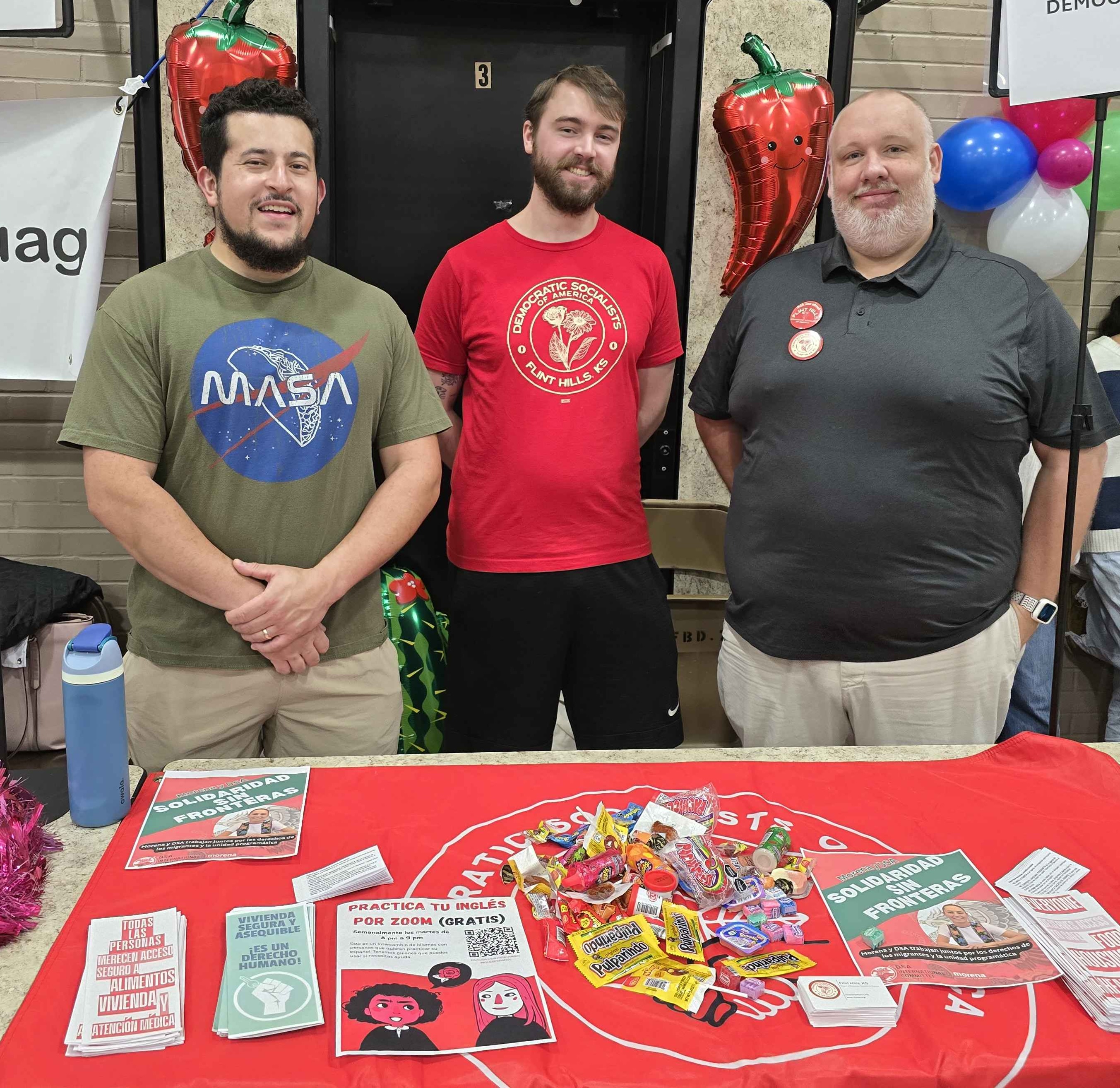 Matth, Noah, and Derron tabled at the MHK Friesta Taltento y Cultura, talking about the work our chapter and the National DSA are doing. The sights, smells, and sounds were all fantastic!