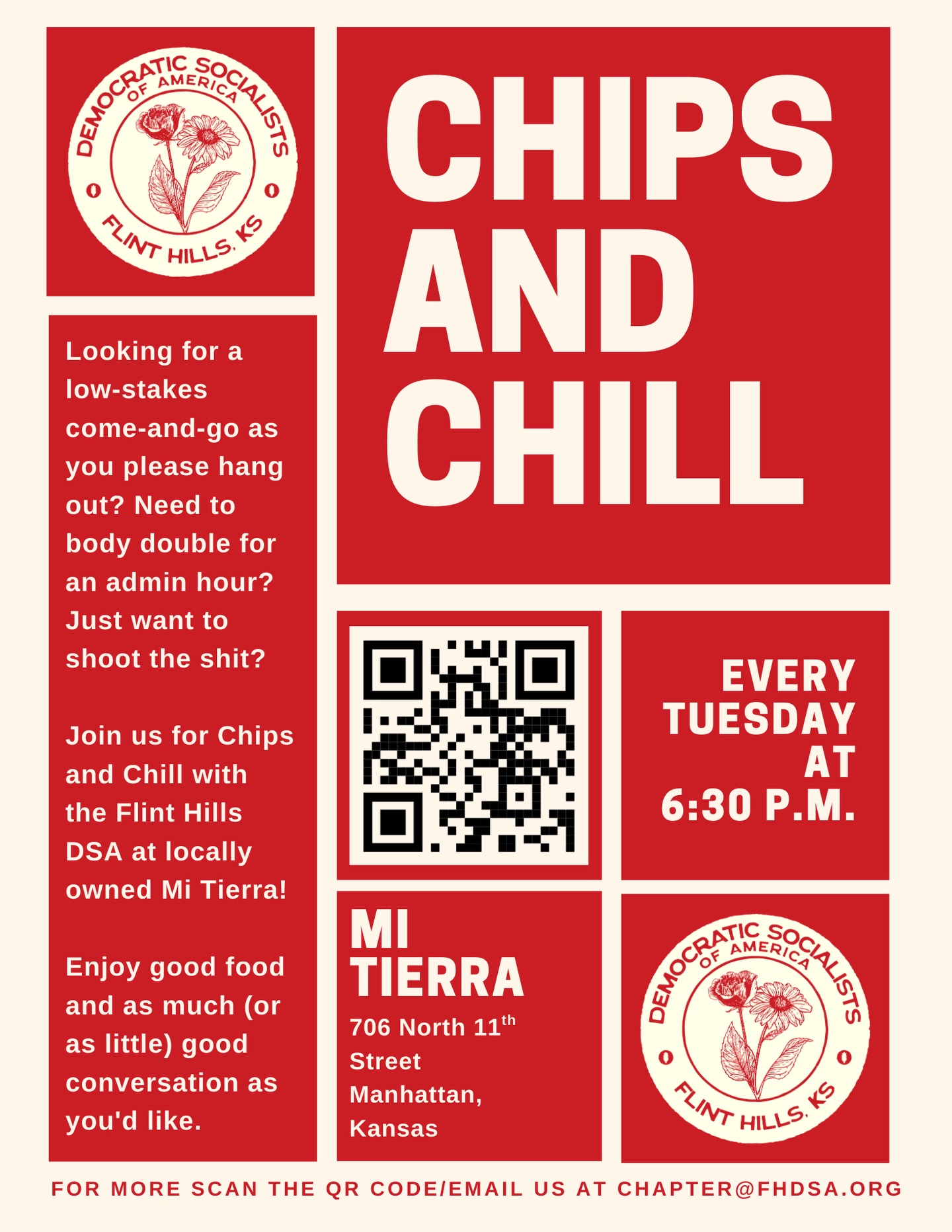 At the February Chapter meeting, our member and newly elected Co-Coordinator of Finance, Babe, mentioned hosting a weekly casual event, like some of the other Kansas DSA chapters do in order to create a low-stakes envrionment for those interested in the DSA to come and meet with current members. The Chapter organized Chips and Chill on Discord, which will take place every Tuesday evening at 6:30pm at Mi Tierra restaurant (706 North 11th St. Manhattan, KS).
